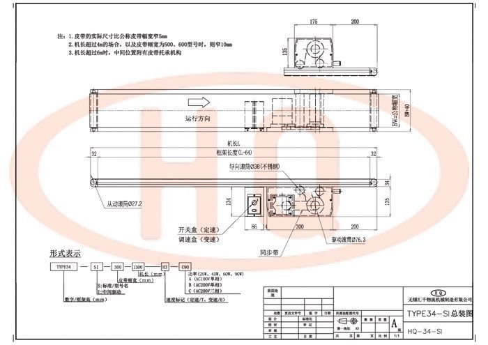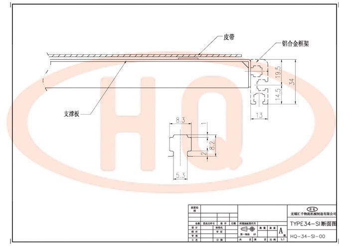 使用34mm鋁合金型材支架,皮帶傳送、驅動。驅動部使用調整機構,可以調整皮帶的松緊。驅動部為鑄鋁一體成型,主動輪和從動輪為鋁同步輪,皮帶為樹脂同步帶,具有精度高、靜音性及耐久性,無油脂污染。
