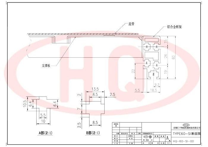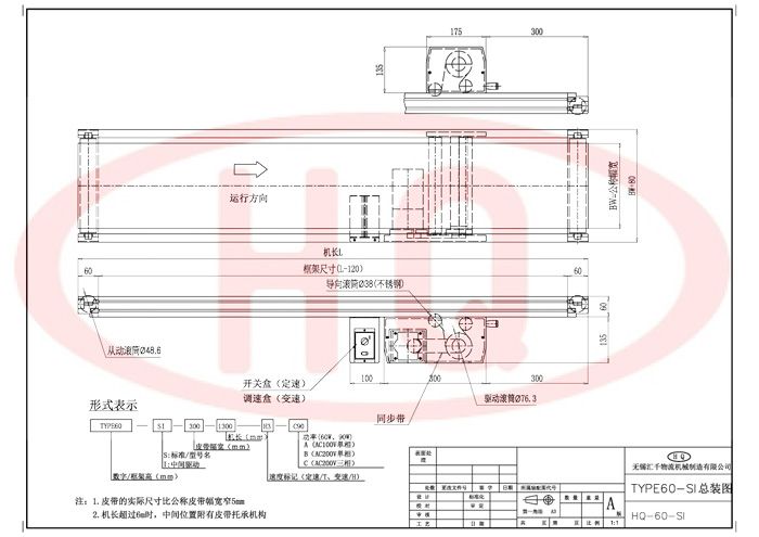 使用強度更高的60mm鋁合金型材支架,皮帶傳送、驅動,直線輸送。驅動部使用調整機構,可以調整皮帶的松緊。驅動部為鑄鋁一體成型,主動輪和從動輪為鋁同步輪,皮帶為樹脂同步帶,具有精度高、靜音性及耐久性,無油脂污染。