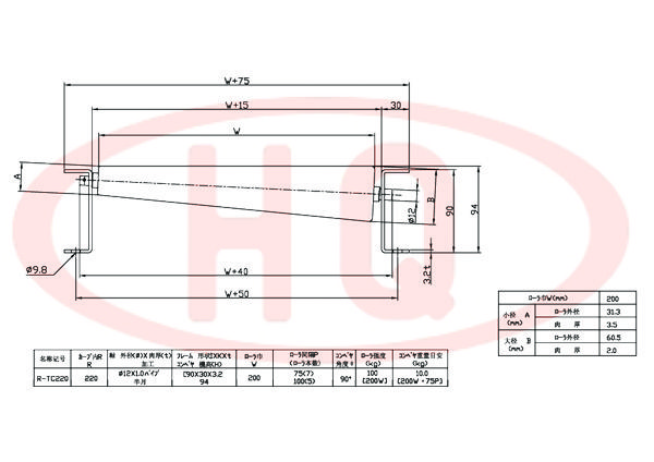 | 型 號 | 轉彎半徑 R | 軸外徑(φ)×壁厚(t) 加工 | 支架形狀I×K×t 輸送機高(H) | 滾筒幅寬 W | 滾筒間距 P (滾筒數) | 輸送機 角度 θ | 滾筒強度 (kg) | 輸送機重量 (kg) | ||||